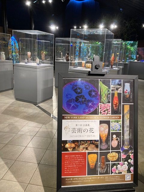 常設のティファニーランプに加えて、ガレやドームの花モチーフのガラスを展示しています。